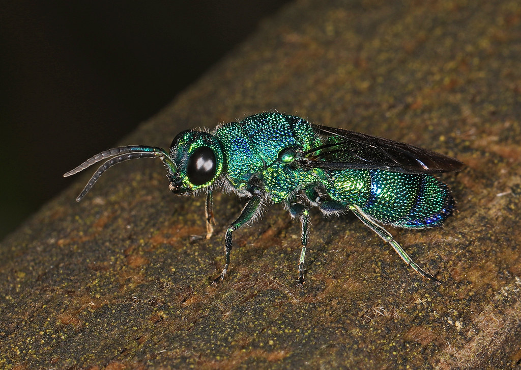 The reason for cuckoo wasp’s iridescence isn’t fully understood, but part of it might be due to their general lifestyle as kleptoparasites (nest parasites). You see, cuckoo wasps get their collective common name from parasitizing other bee and wasp nests by laying their brood in another species’ nest and walking away. [Some species in Asia will also parasitize walking stick nests]. Female cuckoo wasps will observe other female wasps setting up nests and will either sneak in to lay her eggs or will hitch a ride on food being drug into the nest. If they get caught by the other mother, they roll into a defensive ball and rely on their dense exoskeleton to protect them. It is believed the light refraction on cuckoo wasp’s exoskeleton helps provide a type of camouflage from other Hymenoptera. The light refraction might also aid in buffering heat.